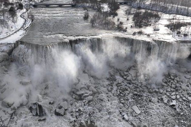 Imágenes desde el cielo captaron las secuelas de la catastrófica tormenta, que azotó a unos 40 kilómetros al sur de las cataratas. Se formaron montañas de hielo cerca de la orilla y la vasta extensión quedó cubierta por una espesa capa de nieve blanca.