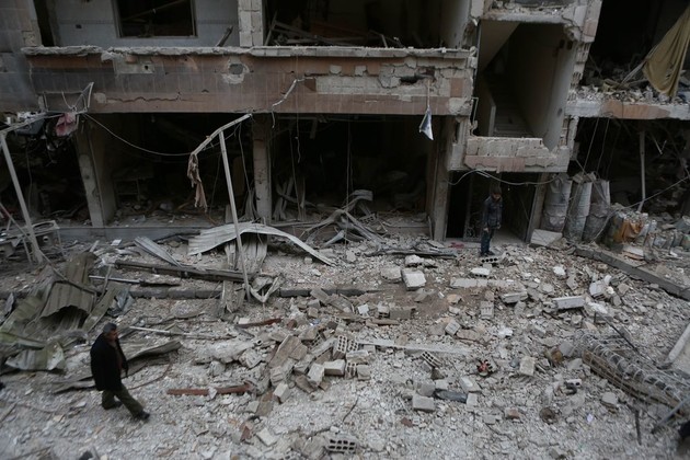 Un habitante de la región de Guta Oriental, Siria, recorrIó calles de la ciudad, muy afectadas por los ataques aéreos el 22 de febrero.