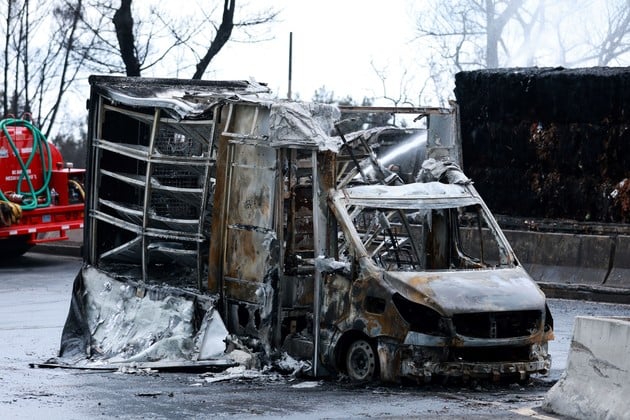 Un camión de carga que circulaba sobre la avenida quedó calcinado tras la explosión junto con muchos otros vehículos cercanos.Un camión de carga que circulaba sobre la avenida quedó calcinado tras la explosión junto con muchos otros vehículos cercanos.
