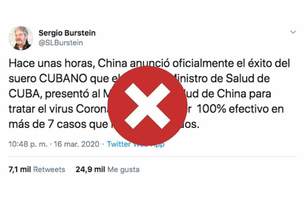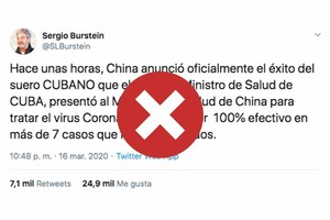 Además de los mensajes de WhatsApp, la desinformación sobre el supuesto “suero cubano” fue difundida en la Argentina por la cuenta de Twitter de Sergio Burstein, donde hasta ayer cosechaba más de 7.100 retuits y 25.000 “me gusta”.