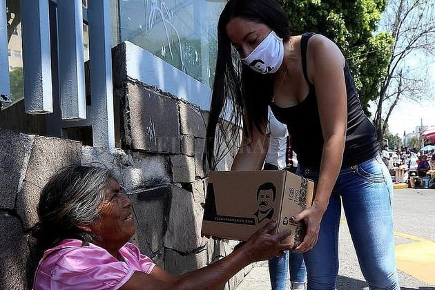 “Nos encontramos aquí en la casa de la familia del Chapo Guzmán preparando las chapodespensas para aportar nuestro granito de arena a la contingencia y llevarlas a las personas de la tercera edad”, relata una voz radiofónica mientras aparece en streaming su hija empaquetando cajas de alimentos. La retransmisión muestra también a otras dos jóvenes que la ayudan llevando una mascarilla con la figura del narcotraficante.