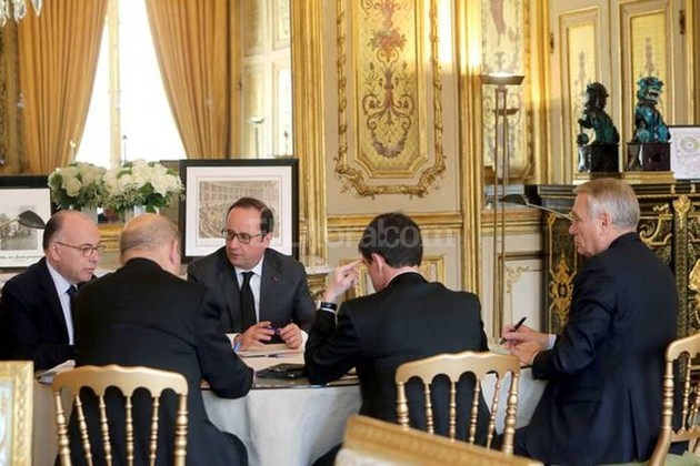Hollande se reunió con el primer ministro Manuel Valls, el ministro de Extriores, Jean-Marc Ayrault, y los responsables de Interior, Bernard Cazeneuve, y Defensa, Jean-Yves Le Drian, para deliberar sobre la situación, informó la Presidencia en su cuenta de Twitter.