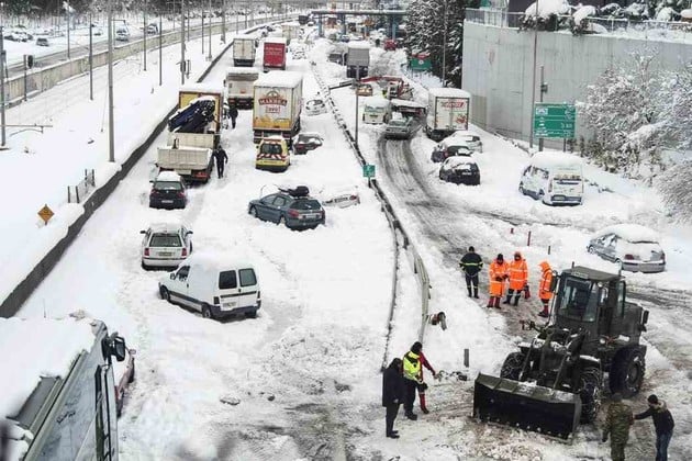 En Atenas, los operarios trabajaban para liberar a los alrededor de 200 o 300 conductores que seguían atrapados en una importante autopista que cruza la capital, Atenas, y la conecta con el aeropuerto de la ciudad.