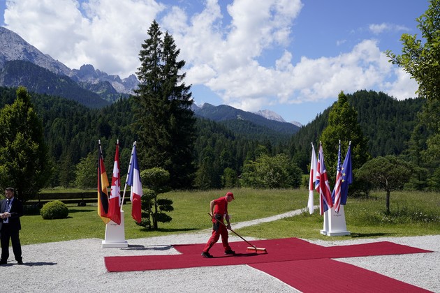 Se barre la alfombra roja antes de que el canciller alemán Olaf Scholz dé la bienvenida oficial al presidente de los Estados Unidos, Joe Biden, a la Cumbre del G7 en el castillo de Schloss Elmau, Baviera, Alemania, el 26 de junio de 2022. Foto: Reuters