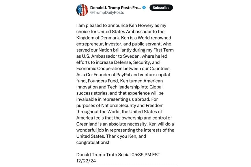A pocos días de asumir, y retomando ideas de su primera gestión, el magnate de 78 años aseguró que iba a comprar la isla e insinuó en conferencia de prensa que en caso de no poder avanzar con la negociación, insistiría con coerción económica o militar.