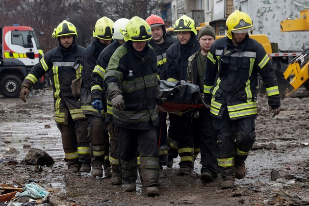 El ministerio publicó imágenes en la aplicación de mensajería Telegram que muestran el edificio con varios pisos superiores destrozados y espesas columnas de humo elevándose hacia el cielo. Los bomberos y docenas de rescatistas estaban buscando entre los escombros.