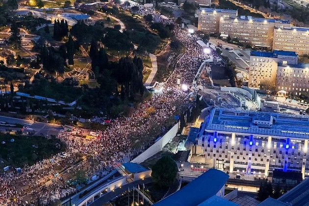 Una vista desde un dron de los manifestantes frente al parlamento israelí, pidiendo la renuncia del primer ministro israelí, Benjamín Netanyahu, y la celebración de elecciones generales tras el mortal ataque contra Israel por parte del grupo islamista palestino Hamas y la consiguiente guerra en Gaza. Foto: REUTERS / Ilan Rosenberg.