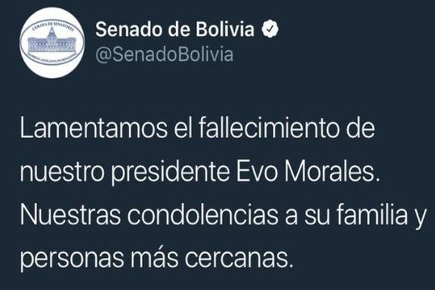 "Lamentamos el fallecimiento de nuestro presidente Evo Morales. Nuestras condolencias a su familia y personas más cercanas", señalaba el mensaje publicado en el perfil del Senado poco antes de las 16 horas (17 de Argentina) y que se viralizó rápidamente en la red social.