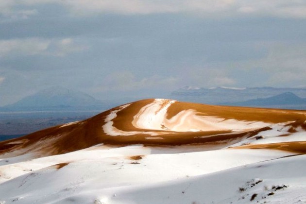 El usual paisaje de dunas con arena del Sahara se transformó en un cuadro con pinceladas de nieve blanca.