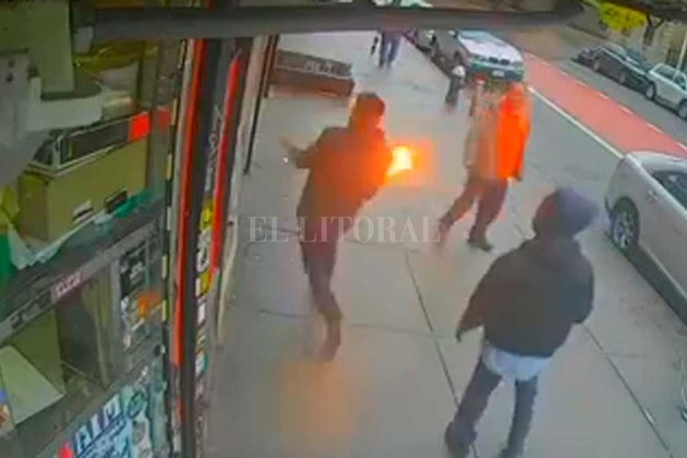 Como lo muestras las imágenes, el sujeto se paró en la puerta del negocio y arrojó una bomba molotov. También se puede apreciar cómo dos hombres salen corriendo de entre las llamas para salvar su vida.