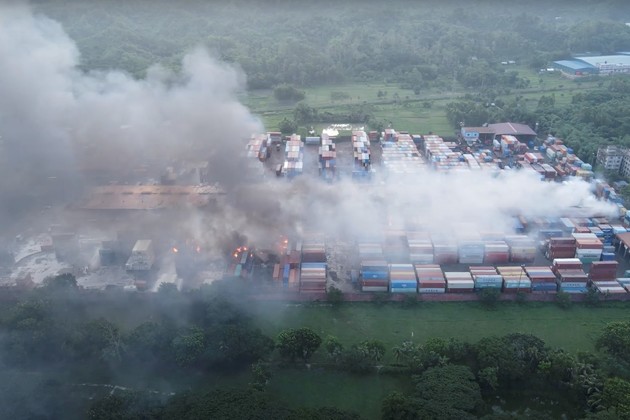 Las imágenes de un dron muestran humo saliendo del lugar después de que estalló un incendio masivo en un depósito de contenedores interior en Sitakunda, cerca de la ciudad portuaria de Chittagong, Bangladesh, el 5 de junio de 2022 en esta imagen fija obtenida de un video. Foto: vía Reuters
