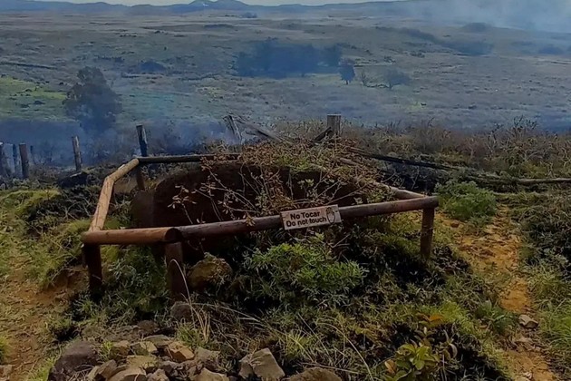 Edmunds Paoa declaró que el incendio que esta semana arrasó 104 hectáreas de pasto dañó especialmente un sector de la cantera del interior del cráter donde hay unos 100 moáis que están semienterrados. "El 20% están afectadas'', añadió. En los faldeos exteriores del volcán Rano Raraku también se observan algunos gigantes de piedra quemados.