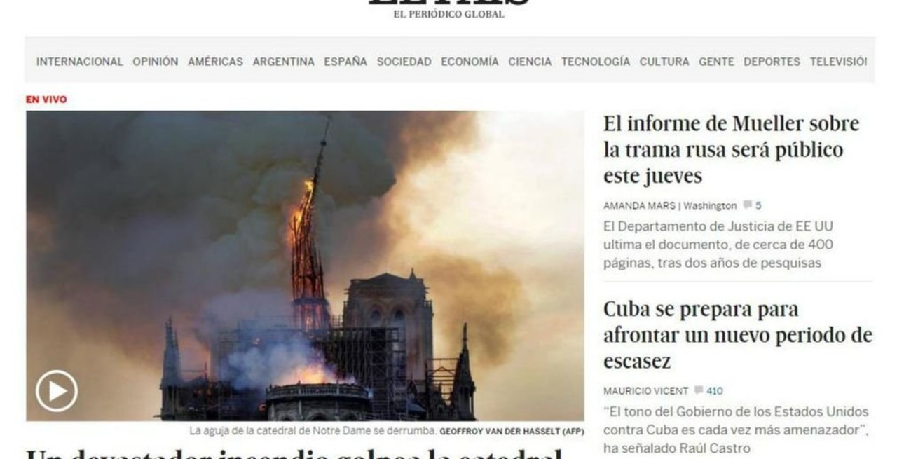 Las imágenes de las llamas consumiendo la catedral de Notre Dame, ícono de la ciudad de París, estuvieron presentes en las portadas de los principales medios periodísticos del mundo.