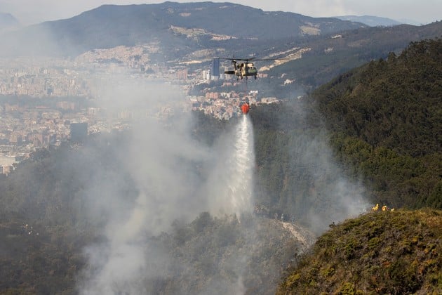 Uno de los incendios afectó los imponentes cerros orientales de Bogotá, siendo visible el humo -esparcido por el viento- desde varios sectores de la capital de Colombia. En la imagen, un helicóptero descarga agua sobre dichas colinas. Reuters / Antonio Cascio