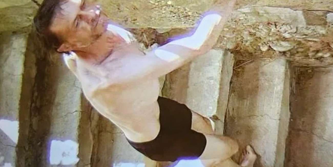 Una foto de vigilancia compartida por la policía de Montana con el público, en la que se ve al sospechoso, Michael Brown, sin camisa, descalzo y vistiendo solo pantalones cortos negros, y bajando un tramo de escaleras mientras se apoya contra una pared de piedra.