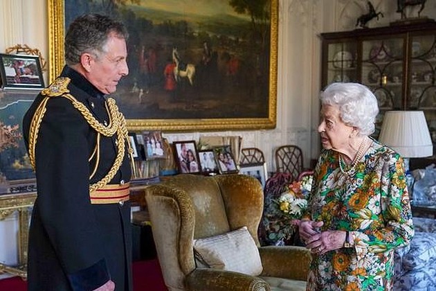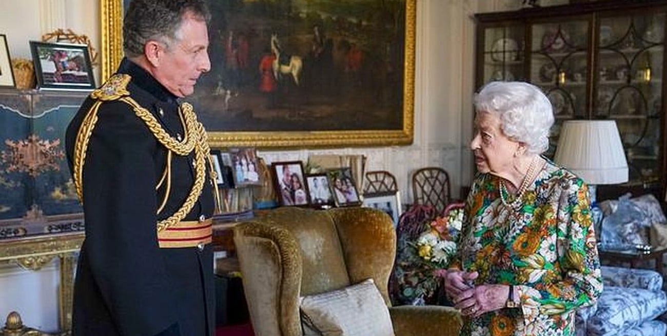 Las imágenes del encuentro muestran a la reina de pie con un vestido de flores hablando con el militar uniformado que está a punto de dejar su puesto.