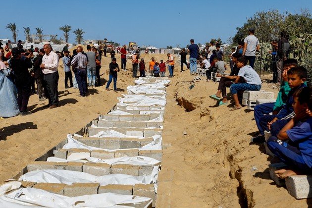 A pesar de este mensaje de la autoridad de salud gazatí, Reuters compartió una vista aérea que muestra a personas enterrando cuerpos no identificados de palestinos en Deir Al-Balah, en el centro de la Franja de Gaza.