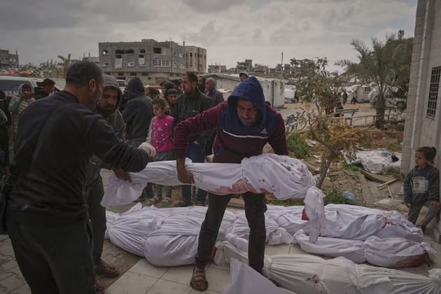 Palestinos preparan los cuerpos para el entierro de víctimas de un bombardeo.
