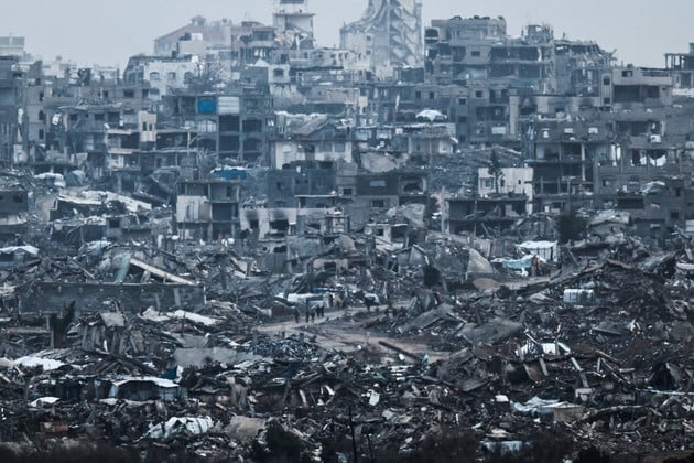 Ciudadanos palestinos entre ruinas tras bombardeos en Gaza, este martes. Foto: Reuters
