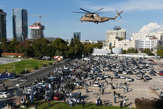 Un helicóptero transportando a rehenes liberados llegando al centro médico, en Petah Tikva, Israel.