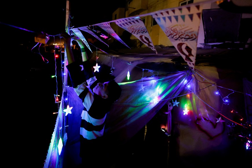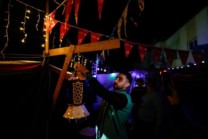 "El Ramadán es un mes bendito a pesar de que este año no es como todos los años, pero somos firmes y pacientes, y recibiremos el mes de Ramadán como siempre, con decoraciones, canciones, con oraciones, ayunando", dijo Nehad El-Jed, desplazada con su familia en Gaza.