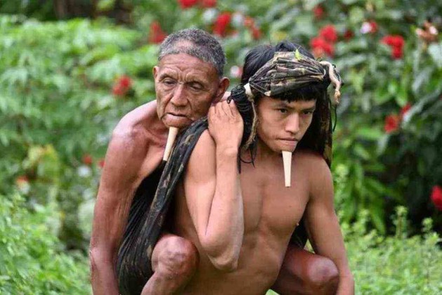 La imagen muestra a Tawy Zó'é, de 24 años, luchando por cargar a Wahu Zó'é, de 67.