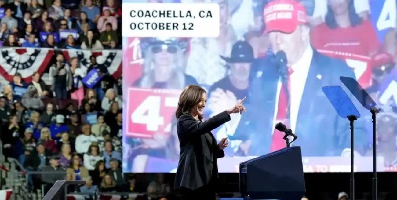 La candidata presidencial demócrata, la vicepresidenta Kamala Harris, habla mientras aparece en pantalla una imagen de su rival Donald Trump, durante un mitin de campaña en el Erie Insurance Arena, Erie, Pensilvania. DW/AP