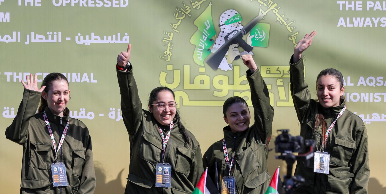 Milicianos de las brigadas de Al Qassam, el brazo armado de Hamás, entregaron este sábado a la Cruz Roja a las cuatro mujeres soldado israelíes liberadas como parte de la tregua con Israel, en una ceremonia organizada en la plaza de Palestina de la Ciudad de Gaza ante cientos de personas y retransmitida en directo por Al Jazeera.