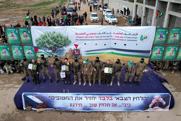 Tres de los liberados, Eliya Cohen, Omer Shem Tov y Omer Wenkert, fueron trasladados por hombres armados y encapuchados a un escenario en Nuseirat, en el centro de Gaza, donde fueron exhibidos ante una multitud antes de ser escoltados hasta los vehículos del CICR. Los otros dos rehenes fueron entregados previamente en Rafah, en el sur del territorio palestino.