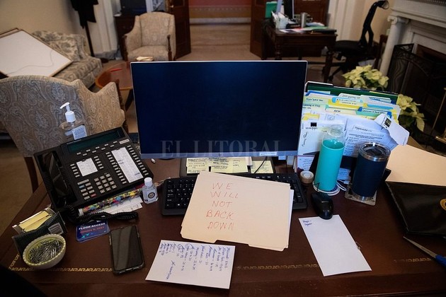 Una de la postales de la inédita jornada en la que seguidores del presidente saliente de Estados Unidos, Donald Trump, coparon el Capitolio será la de un manifestante cómodamente sentado en el despacho de la presidenta demócrata de la Cámara de Representantes, Nancy Pelosi, donde dejaron un mensaje: "No retrocederemos".
