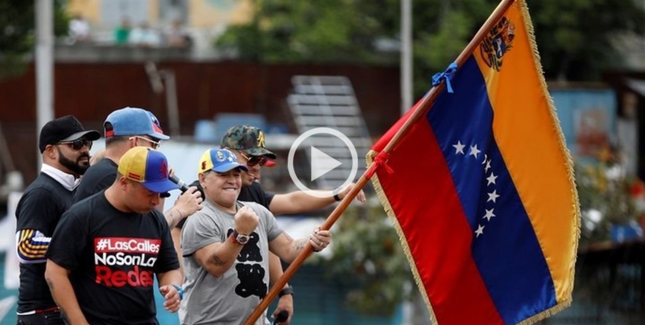 Maradona fue la atracción principal en el show previo al discurso del mandatario, en el que salió ondeando una bandera venezolana y bailando, causando la euforia de la multitud reunida para el acto.
