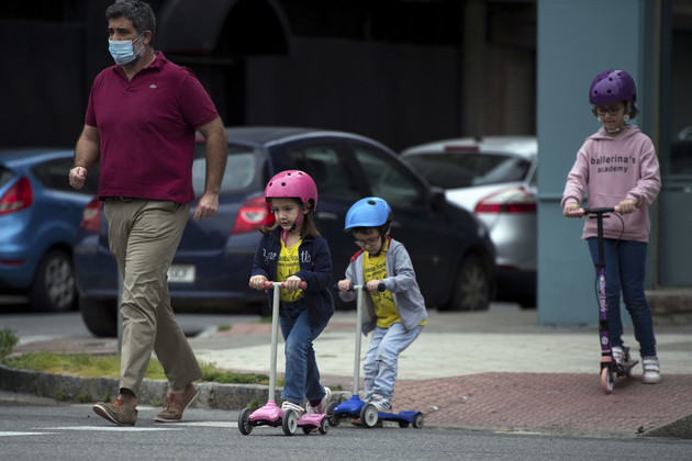 CRISTINA QUICLER A man crosses a street with three children on scooters Seville on April 26, 2020 amid a national lockdown to prevent the spread of the COVID-19 disease. - After six weeks stuck at home, Spain's children were being allowed out today to run, play or go for a walk as the government eased one of the world's toughest coronavirus lockdowns. Spain is one of the hardest hit countries, with a death toll running a more than 23,000 to put it behind only the United States and Italy despite stringent restrictions imposed from March 14, including keeping all children indoors. Today, with their scooters, tricycles or in prams, the children accompanied by their parents came out onto largely deserted streets. (Photo by CRISTINA QUICLER / AFP)CRISTINA QUICLER A man crosses a street with three children on scooters Seville on April 26, 2020 amid a national lockdown to prevent the spread of the COVID-19 disease. - After six weeks stuck at home, Spain's children were being allowed out today to run, play or go for a walk as the government eased one of the world's toughest coronavirus lockdowns. Spain is one of the hardest hit countries, with a death toll running a more than 23,000 to put it behind only the United States and Italy despite stringent restrictions imposed from March 14, including keeping all children indoors. Today, with their scooters, tricycles or in prams, the children accompanied by their parents came out onto largely deserted streets. (Photo by CRISTINA QUICLER / AFP)