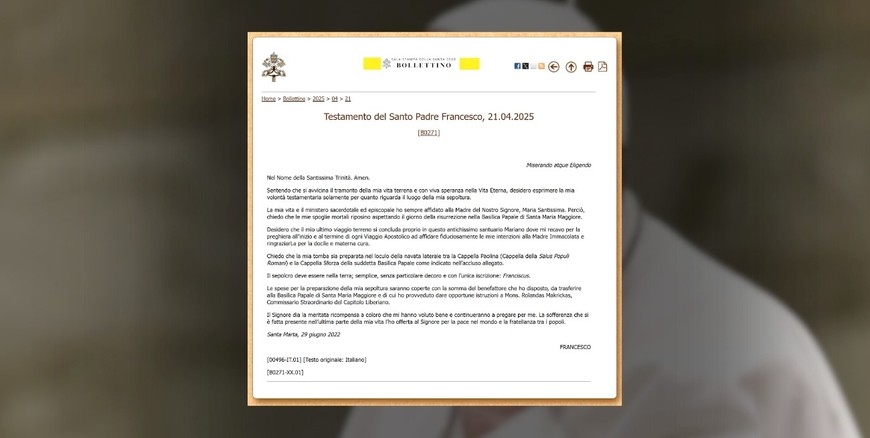 El Vaticano difundió el testamento del pontífice, donde expresó su deseo de ser sepultado en tierra, sin decoraciones, en la Basílica de Santa María la Mayor de Roma. "El sepulcro debe estar en la tierra, sencillo y con la única inscripción: Franciscus", escribió. La administración del sepelio estará a cargo del arzobispo Rolandas Makrickas y será financiada con una donación personal.