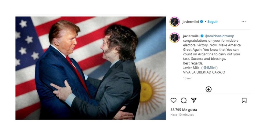 "Felicidades por su formidable victoria electoral. Ahora, haz a América grande de nuevo. Sabes que puedes contar con Argentina para llevar a cabo tu tarea. Éxitos y bendiciones. Saludos cordiales", escribió el presidente argentino en Instagram, cerrando con el tradicional "Viva la Libertad Carajo".