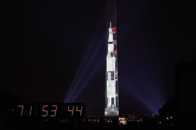 Con ayuda de 24 proyectores de luz, ubicados en la base de la estructura del Monumento, se proyectó la imagen del cohete Saturno V, responsable de impulsar la misión Apolo 11 el 16 de julio de 1969.
