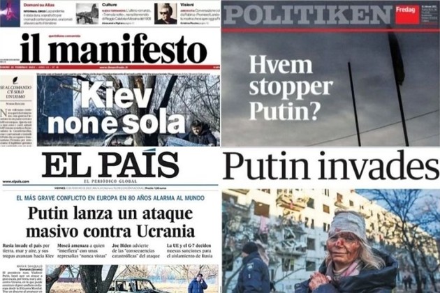 Los medios de comunicación del Viejo Continente ilustraron sus portadas del viernes 25 de febrero resaltando el horror del ataque ruso.
