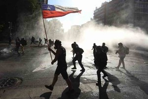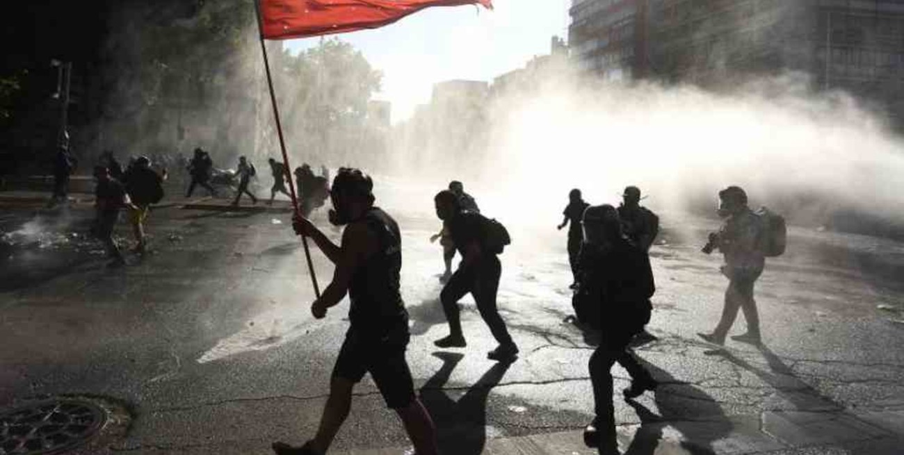 EFE Miembros de carabineros dispersan a los manifestantes lanzando agua durante una nueva jornada de protestas en contra del gobierno del presidente de Chile, Sebastián Piñera, en Santiago (Chile).