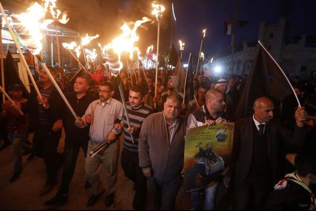 En la ciudad cisjordana de Ramallah, unos 5.000 palestinos participaron en una marcha de protesta contra la inauguración, programada para esta tarde, de la embajada de Estados Unidos en Jerusalén.