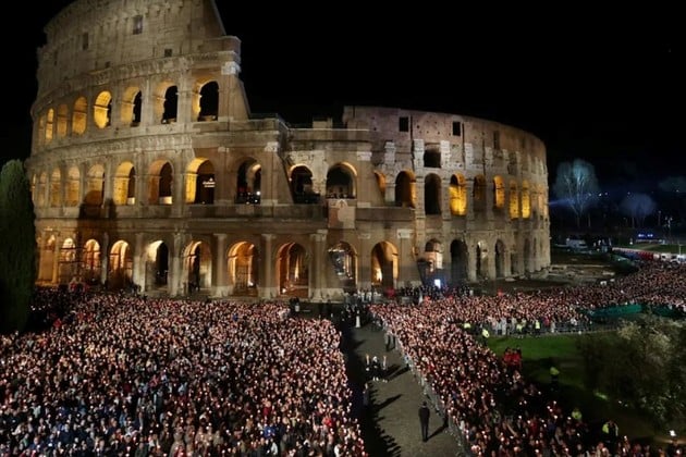 El Papa presidió un servicio religioso de Viernes Santo en la Basílica de San Pedro antes de la procesión nocturna en el Coliseo de Roma para conmemorar el día más sombrío del calendario cristiano, que marca la muerte de Jesús por crucifixión.