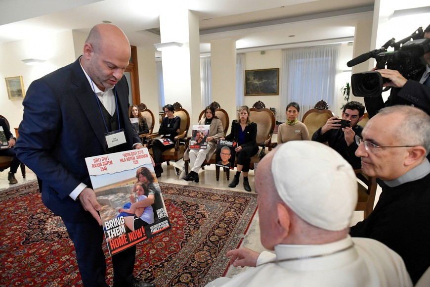 El Papa se reunió también con familiares de los rehenes israelíes tomados por Hamas el 7 de octubre, en un encuentro en el que notaron a un Papa "compasivo" y "atento" a sus peticiones, en definitiva, dispuesto a "hacer algo útil para llegar al fondo de esta situación", según plantearon luego en una conferencia de prensa en la embajada israelí ante la Santa Sede.
