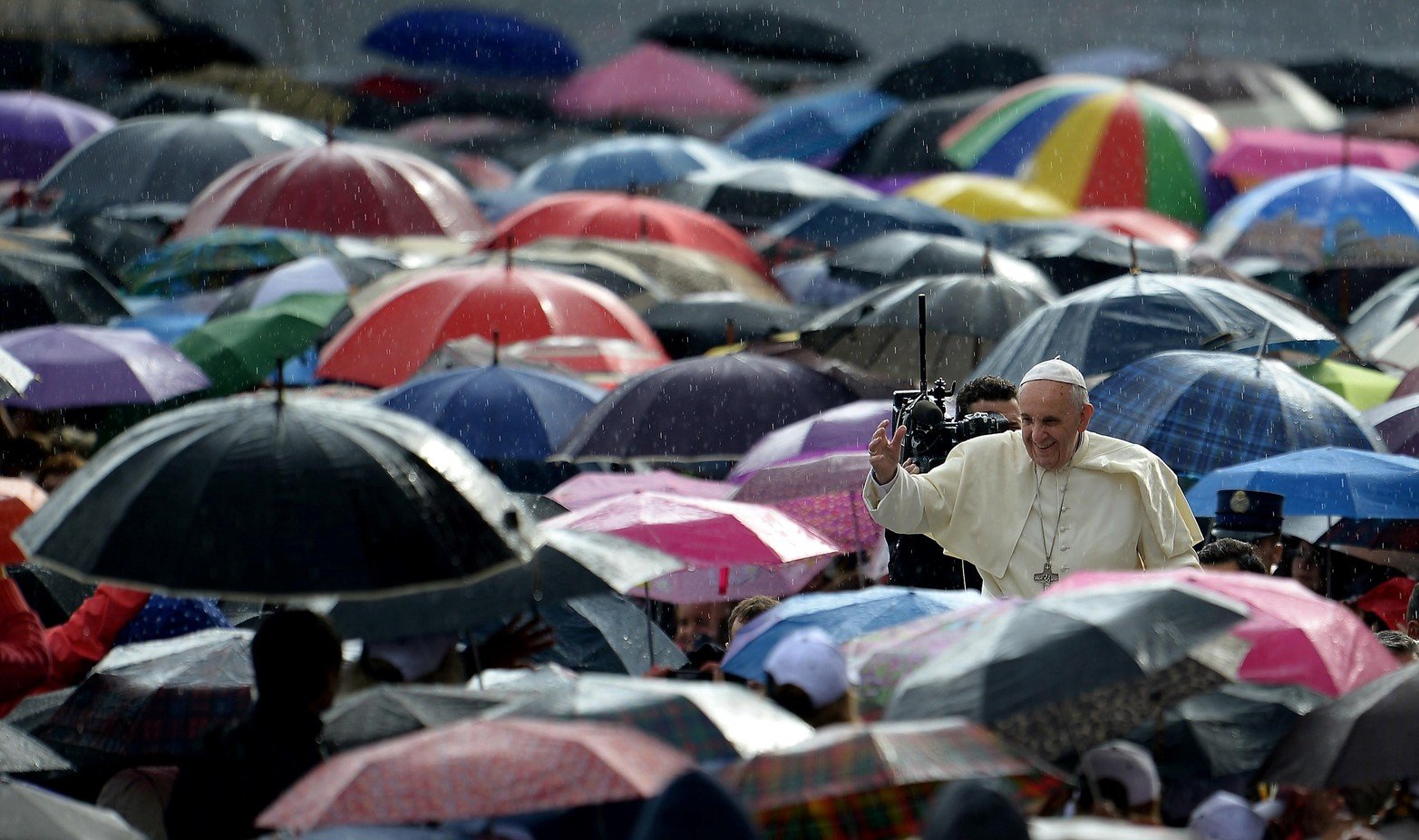 32 / 46 El papa Francisco llega bajo una fuerte lluvia para su audiencia general semanal en la plaza de San Pedro en el Vaticano el 25 de marzo de 2015. Foto: Reuters