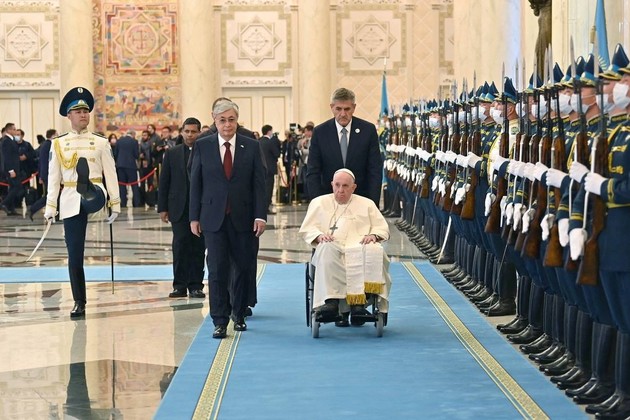 Francisco asiste acompañado por el presidente kazajo Kassym-Jomart Tokayev a una ceremonia de bienvenida Crédito: REUTERS