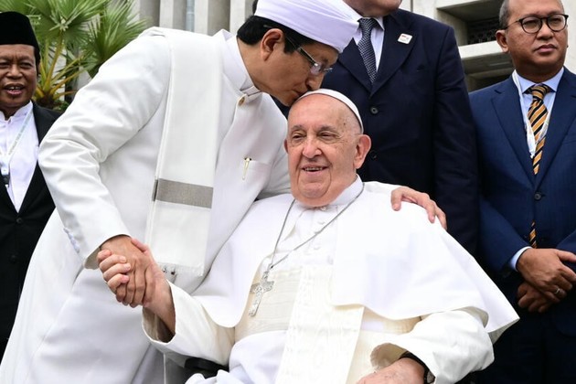 Yakarta, jueves 5 de septiembre de 2024. Cumbre interreligiosa: el imán indonesio Nasaruddin Umar besa al papa Francisco en la cabeza tras la reunión celebrada en la mezquita de Istiqlal. AFP
