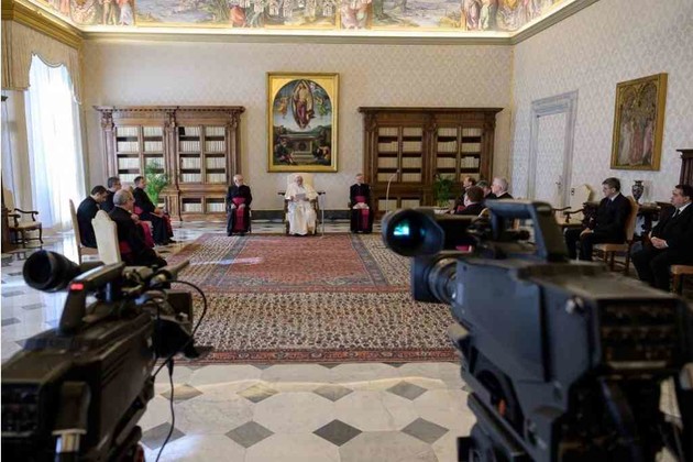 "Por desgracia, hemos tenido que reanudar estas audiencias en la biblioteca para protegernos de los contagios del Covid-19", explicó el papa Francisco con un tono grave en el inicio de un acto que, antes de la pandemia, atraía a miles de personas en la plaza de San Pedro en el Vaticano.
