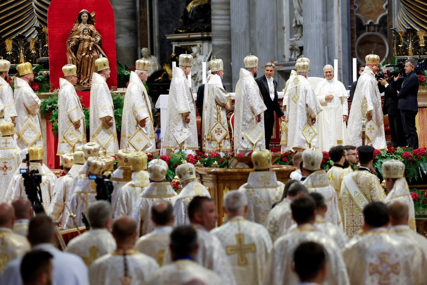 León XIV saluda al clero invitado junto a Sviatoslav Shevchuk, prelado católico ucraniano. Crédito: REUTERS.