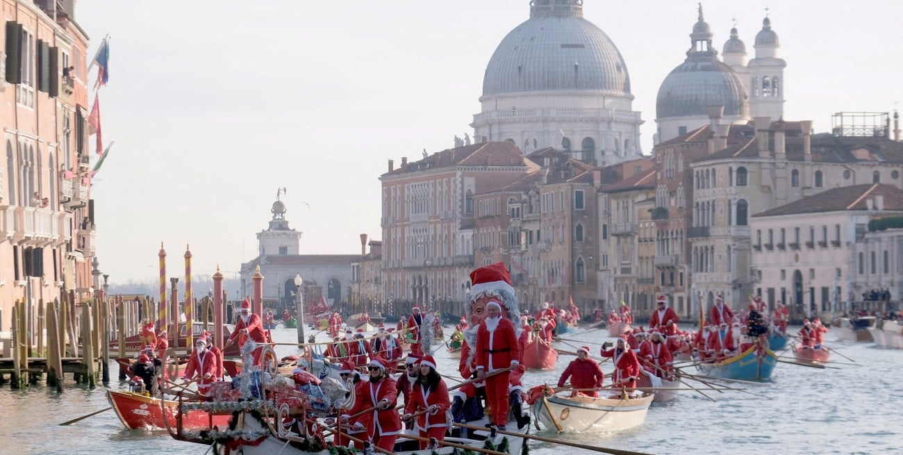 Vestidos de rojo y a bordo de góndolas decoradas, decenas de Papás Noel recorrieron el Gran Canal como parte de una tradición navideña que ilumina la ciudad antes de las fiestas.