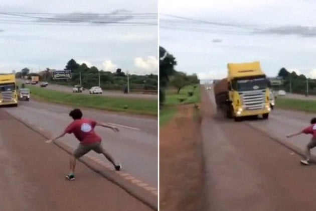 La secuencia, grabada por otra persona, muestra que espera el paso de un camión y vuelve hacia la banquina en el último segundo, a centímetros de un posible atropello. También se lo ve haciendo movimientos con los brazos y el cuerpo, como si “desafiara” a los conductores.