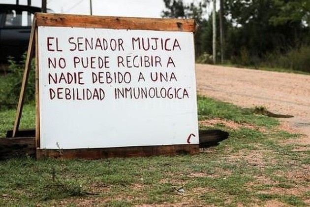 "EL SENADOR MUJICA NO PUEDE RECIBIR A NADIE DEBIDO A UNA DEBILIDAD INMUNOLOGICA (sic)", reza el texto en pintura roja sobre el modesto cartel blanco enmarcado en madera y situado a la entrada de la casa del expresidente (2010-2015) y la exvicepresidenta (2017-2020) de Uruguay, según comprobó este miércoles Efe.