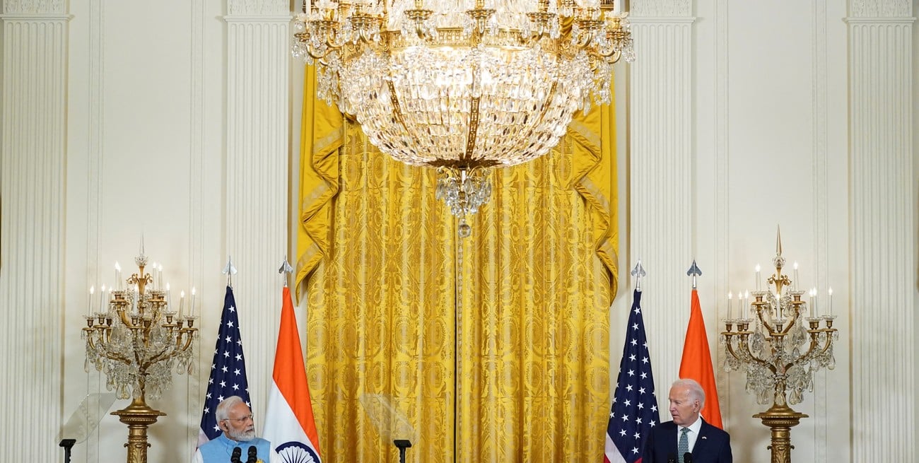 Joe Biden y Narendra Modi, en la conferencia de prensa realizada en conjunto en la Casa Blanca en Washington, Estados Unidos, el 22 de junio de 2023. Créditos: REUTERS/Kevin Lamarque.