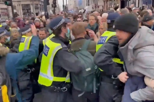 Piers Corbyn, el hermano del exlíder laborista Jeremy Corbyn y crítico de las vacunas y el cierre local, pronunció un acalorado discurso en Hyde Park antes de que la Policía disolviera la reunión y los manifestantes procedieran a marchar por las calles de Londres.